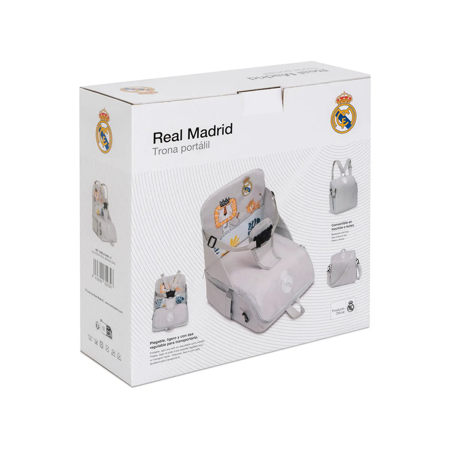 Safety, comfort and passion come together in this Real Madrid baby booster seat. It combines the functionality of a high chair with an ergonomic design, high-quality materials and a secure locking system. It also incorporates a removable, large-capacity bag, perfect for carrying all the essentials, from nappies to toys.