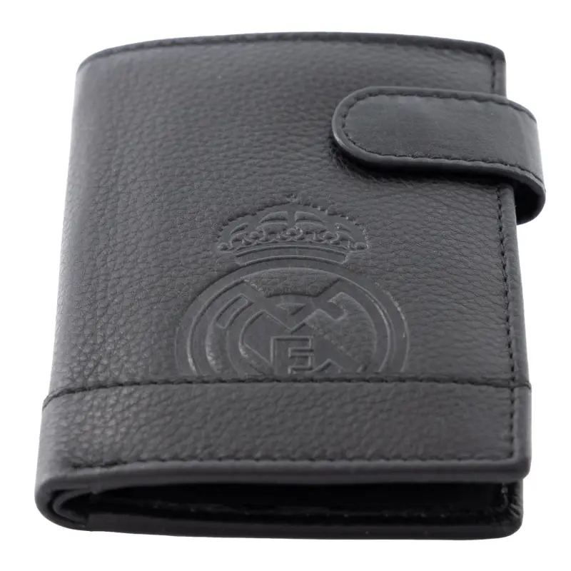 This elegant Real Madrid vertical black leather wallet is the perfect accessory for any fan of the best team in the world. Featuring the iconic club crest and crafted from high quality materials, it offers 8 card slots, coin purse, outer seal and double billfold; ensuring both functionality and style for every day use.