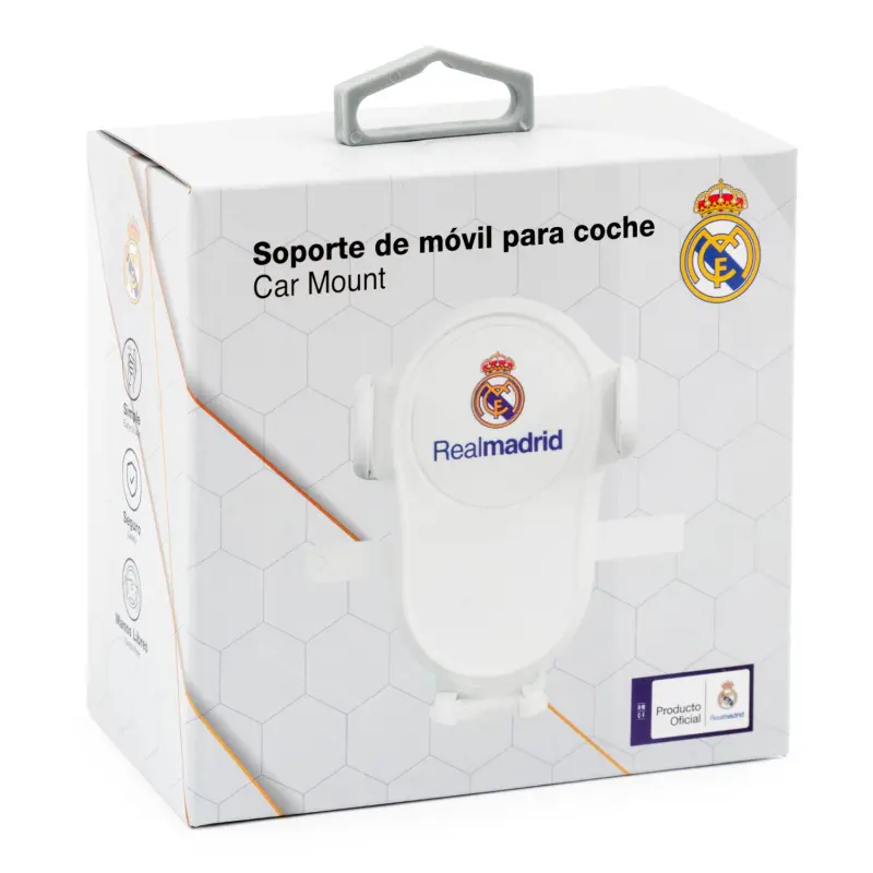Connect with your passion using this Real Madrid car phone holder up to 6.7". Clamps to the air conditioning grill. Universal compatibility. Measurements: 5,5 x 10,8 x 10,5cm.