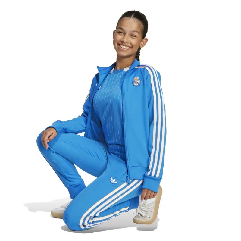A nod to the beautiful game back in the day. This juniors' Real Madrid track top blends classic '80s terrace culture with modern-day adidas comfort. An embroidered Trefoil and team badge show sporty style and your support for the Spanish giants. Soft, stretchy twill fabric and ribbed details ensure you stay comfortable while you represent.