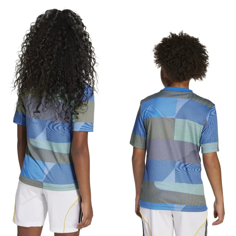 Real Madrid's young fans are sure to feel at home in this juniors' adidas football jersey. Showing off a dynamic design inspired by the club's new-look Bernabéu stadium, it will keep you standing out whether you're polishing your skills or backing your heroes. Moisture-managing AEROREADY keeps you dry through all the action and an embroidered club crest adds the perfect finish.