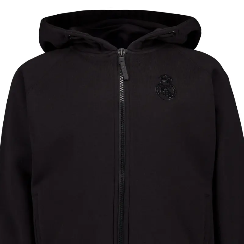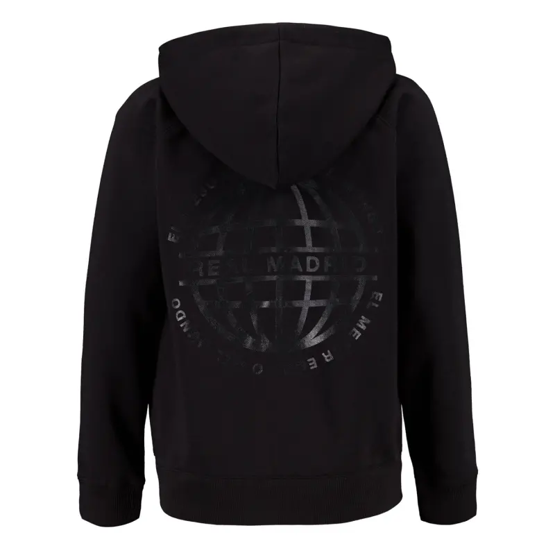 Discover this black youth hoodie with Real Madrid globe backprint from the Blackout collection. This piece represents the perfect balance between simplicity and sophistication, featuring a monochrome print that takes sportswear elegance to the next level.