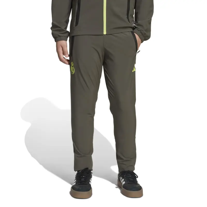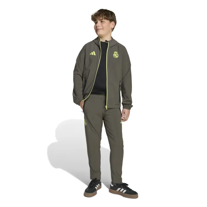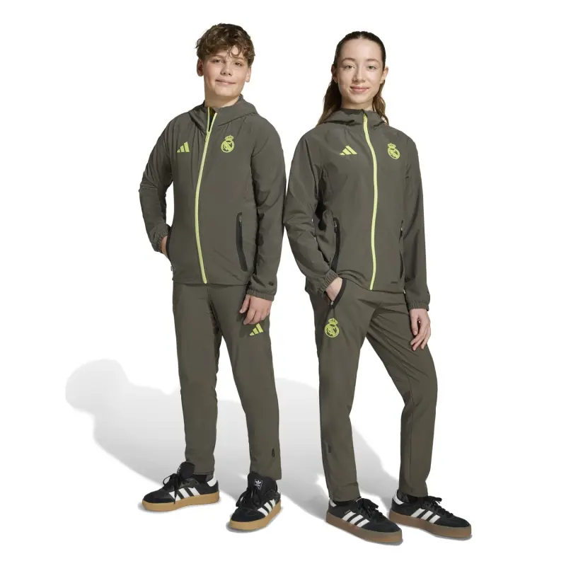Glowing with football pride. The Real Madrid badge on these juniors' adidas pants is just one of its eye-catching details that are finished in reflective print. Less easy to see are the stretchy fabric and moisture-managing AEROREADY that make these comfortable track bottoms perfect for long-distance travel.