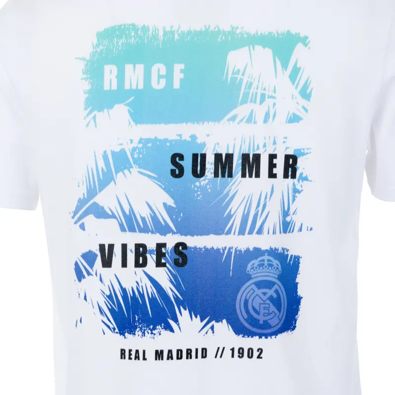 Bring the beach to your wardrobe. This white tee features palm trees and Real Madrid flair, blending tropical chill with club pride. A perfect look for holidays, festivals or summer vibes.