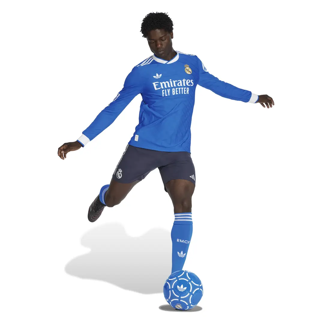 Feel at home in blue. This long-sleeved Authentic Third Jersey from Real Madrid comes in a shade dear to the hearts of Madridistas and fans of the 3-Stripes. The classic adidas Originals colorway is a subtle nod to the Bernabéu Stadium, making it the perfect hue to celebrate the ultimate football partnership. Serrated 3-Stripes and a Trefoil add extra adidas vibe. The performance-focused construction will make you feel right at home on the pitch.