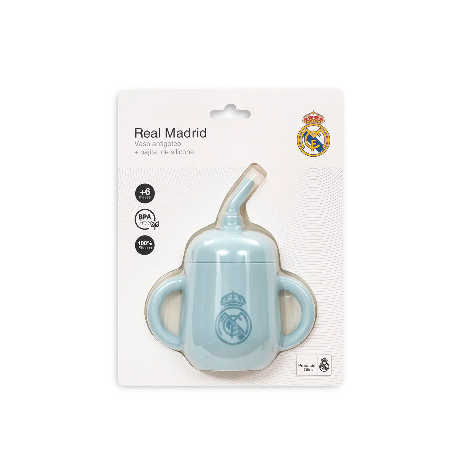 This blue Real Madrid spill-proof cup has a soft silicone straw, ideal for taking care of your baby’s gums, and is perfect for keeping drinks safe without spills. With a practical, safe design and the Real Madrid crest, it is the perfect accessory for future champions.