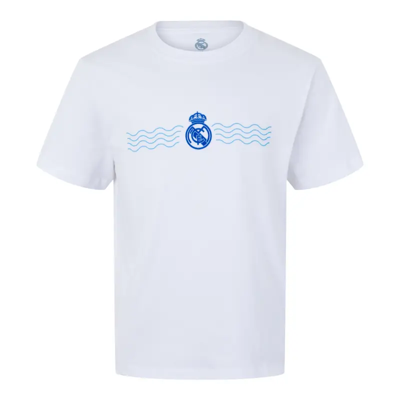 Get ready for summer with this youth Real Madrid white T-Shirt featuring a playful blue shark design. Made from soft, breathable cotton, it's perfect for young fans who want to rep their team in sunny style. Call it the king of the ocean or the Kings of Europe – it’s still Real Madrid, the "Great White Shark".
